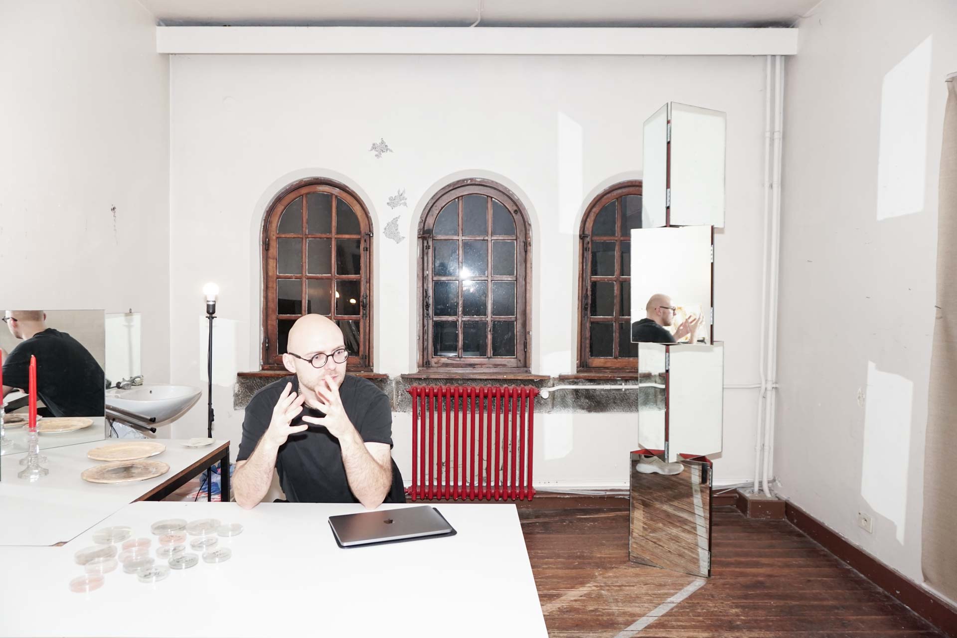 The altarpiece was integrated into an industrial space and invited you, not to dwell on our relationship with the strictly vertical, the supernatural, but to appreciate our relationship to the natural, to each other. It did not provide answers, but raised more. Questions about the role and place we occupy alongside so many other things. During the exhibition, certain panels were overgrown by fungal colonies in the greenhouse, which were then added to the ensemble. Towards the finissage, the central altarpiece was planned to be covered in genetically transformed fungus, as showcase for the ultimate mutual manipulation, but freezing conditions prevented this from happening.